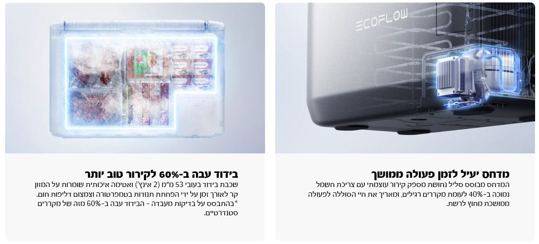EcoFlow GLACIER Classic שומר על טמפרטורה של 4°C מעבר עד 43 שעות בדגם 35L, ועד 39 שעות בדגמי 45L ו-55L** – אידיאלי לשטח, לקמפינג או כהקפאה מגובה בזמן הפסקת חשמל.